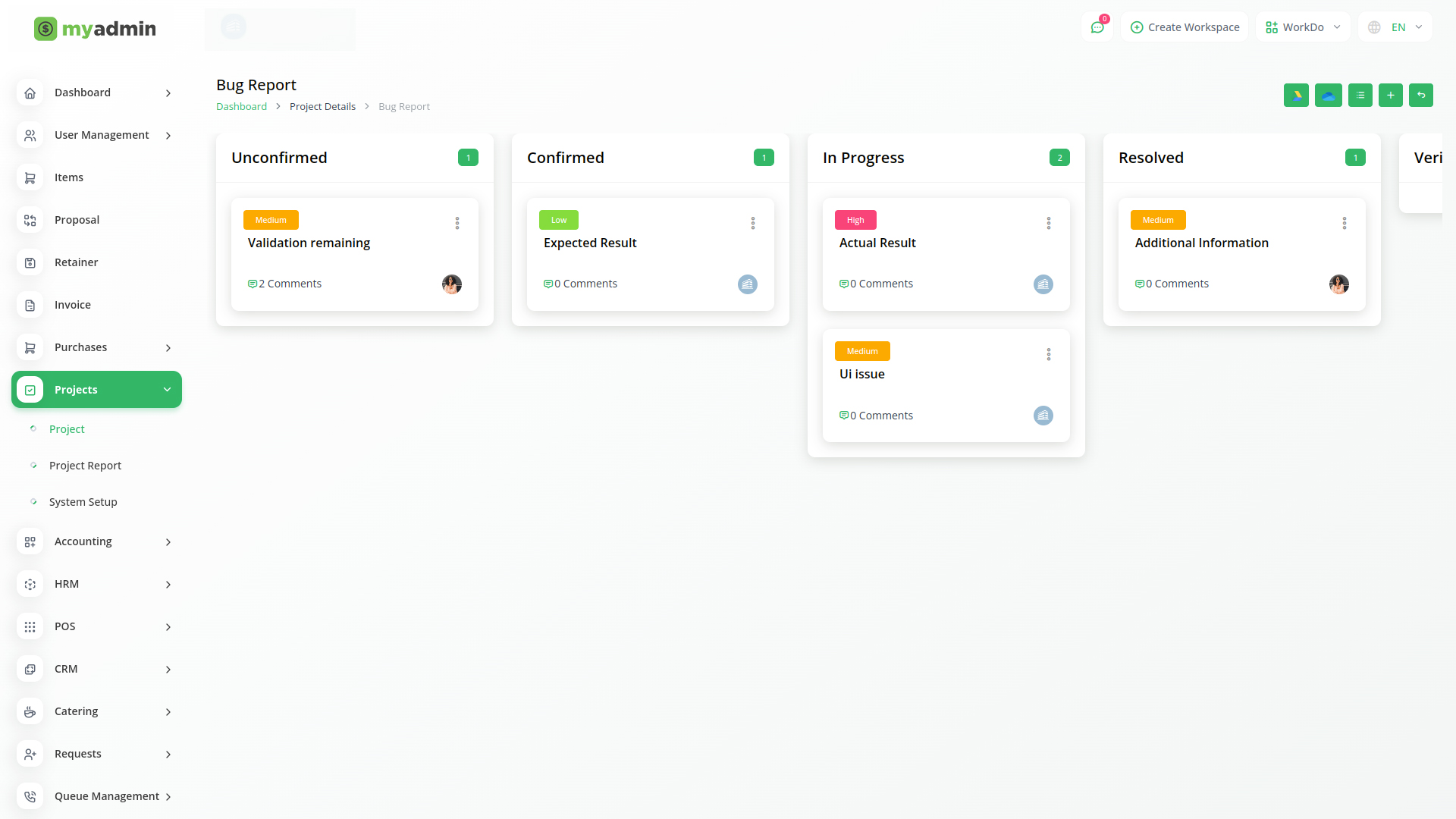Create new bugs and assign users and priority to them. You can write a note in the text box for the bug description. Also, the status of each bug could be changed through an easy drop-down and Kanban drag system.